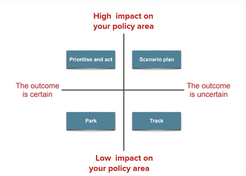 Workshop attendees were provided with a list of likely trends and were asked to complete an impact-certainty matrix using the digital collaboration platform MURAL. Categorising the trends in this way can help identify what next steps, if any, are required (see Figure 1). This futures exercise required attendees to consider what the impact of each trend would be on their local area and think about how certain they are about the impact, and how important they think it will be in terms of affecting well-being. Officials supported the PSB attendees in exploring the potential impacts of a specific trend where they felt the potential impact was important but uncertain. Some key questions were asked during the workshop: